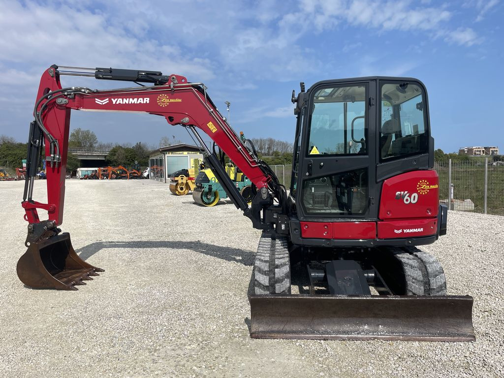 Lo YANMAR SV 60-A è un miniescavatore girosagoma da 5,7 tonnellate, ideale per cantieri urbani grazie all'ingombro posteriore nullo. Dotato di un motore diesel da circa 32,6 kW , offre una profondità di scavo di circa 3,7 metri, elevata stabilità e comfort.